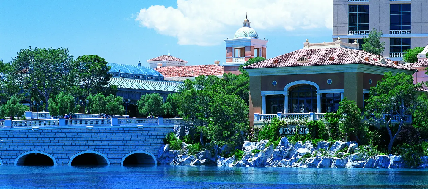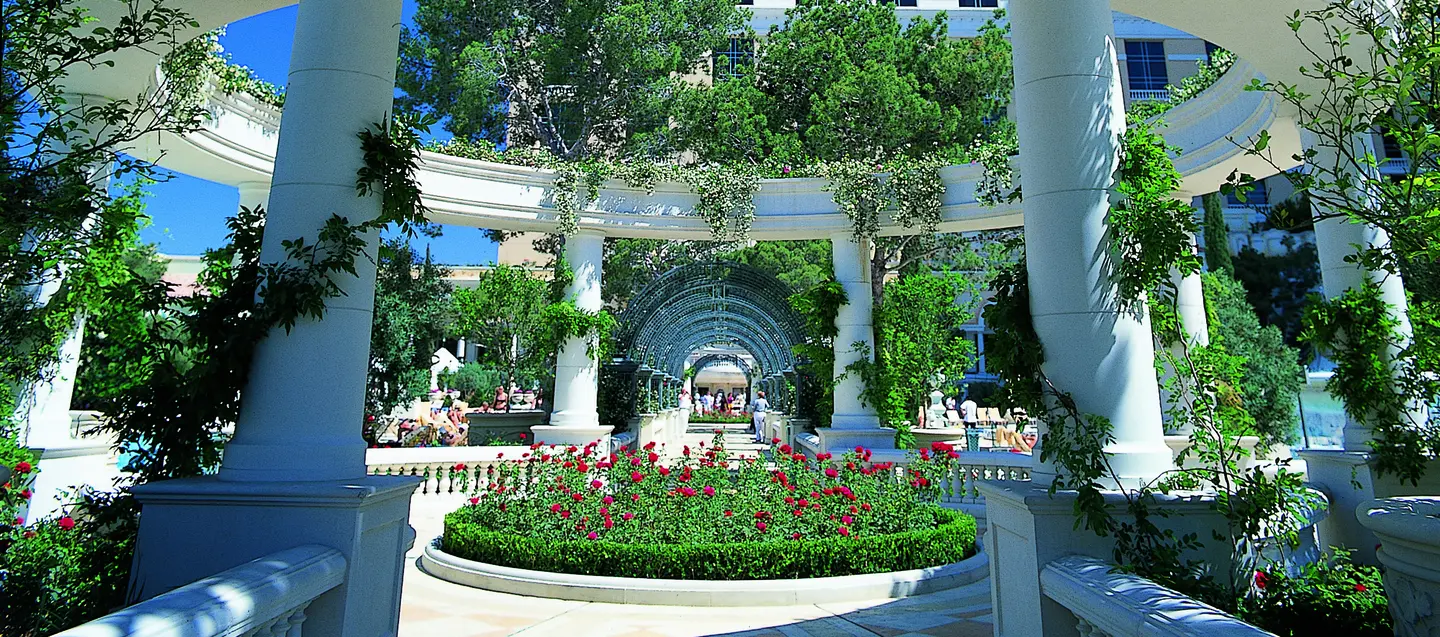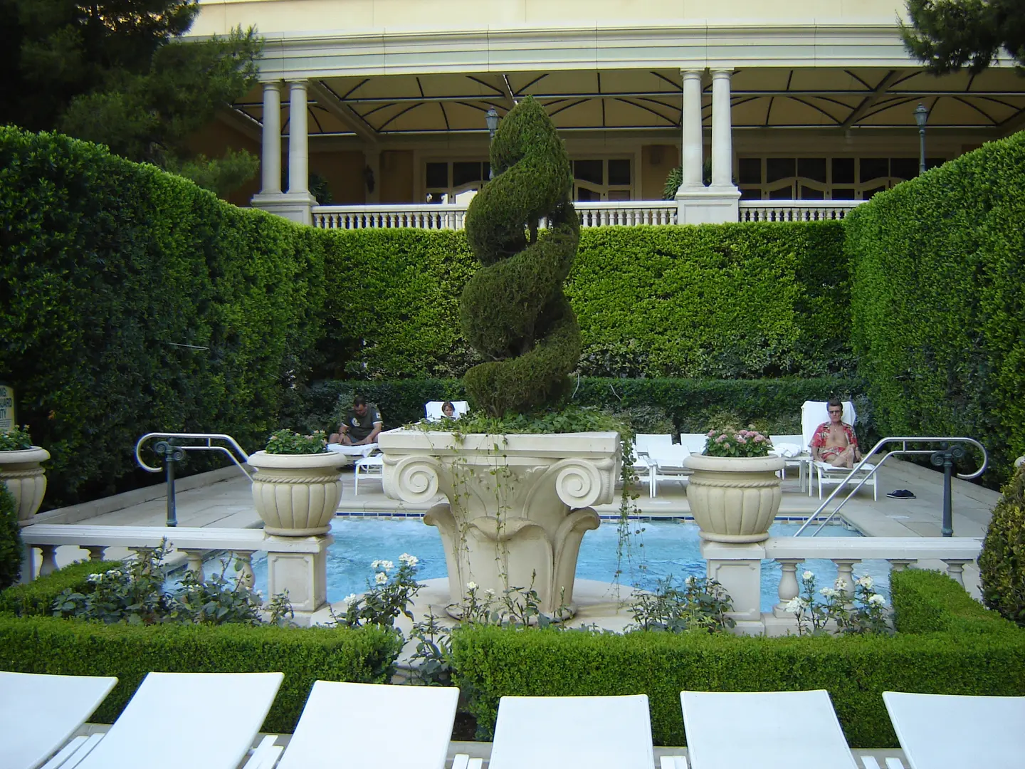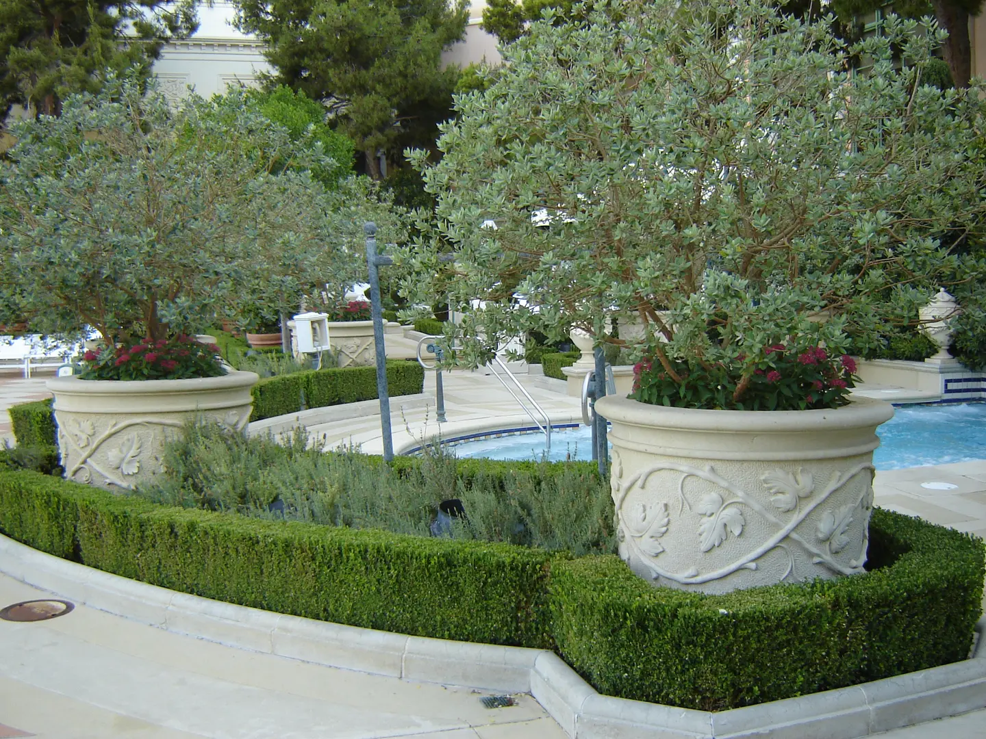 The Bellagio hotel and casino redefines luxury, providing visitors and guests with grand vistas, elegant detail, fine art, and sophisticated entertainment. The grounds of the hotel combine the best elements of both formal and rustic Italian-style garden design, from the formality of the pool area parterre gardens to the more rugged beauty of the lake's rocky shore plantings. Major specimen Pine trees for the Bellagio were salvaged from other properties. The Pinus halepensis (Aleppo Pines) were custom pruned to recreate the look of Italian Stone Pines, consistent with the theme of the hotel's architecture and guest experience.