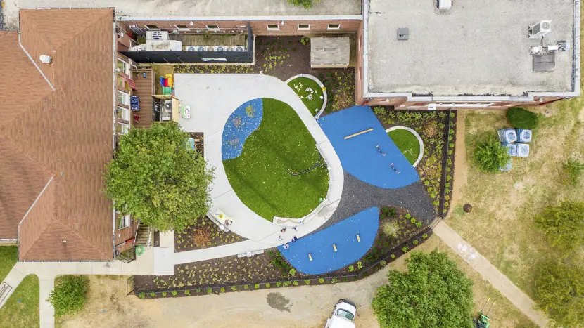 Nationwide, only 40% of teen parents graduate high school. But at Benjamin Franklin High School in Baltimore, the percentage is an astounding 74%. The secret to their success is the community school strategy of the United Way Ben Center in Brooklyn/Curtis Bay, which, in addition to providing a variety of resources for students, their families, and neighborhood residents, supports teen parents pursing a high school diploma. BrightView had the honor of assisting in their noble mission, by helping construct a playground for Ben Center’s tiniest members: the teens’ infants and toddlers.