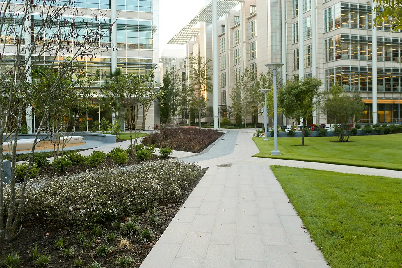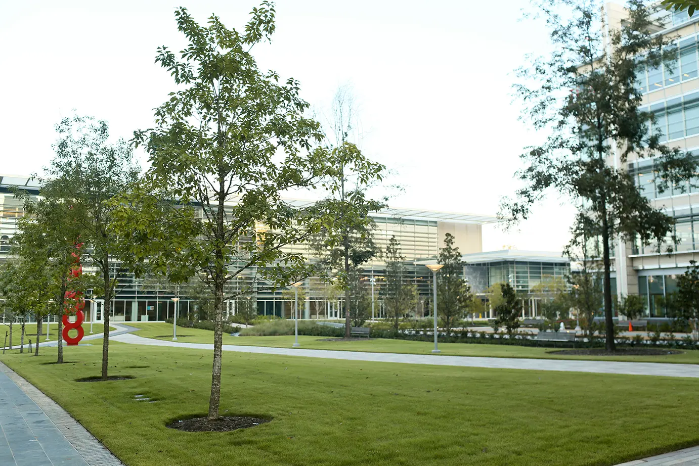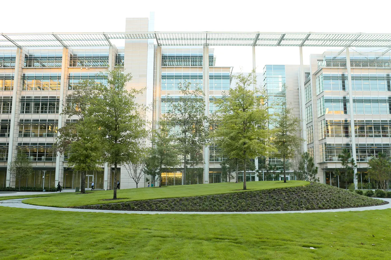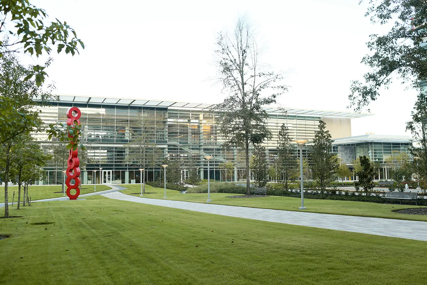 The Exxon-Mobil headquarters in Spring, Texas is a study in environmental stewardship. Opened in 2014, the campus has achieved Gold-level LEED certification, thanks to its sustainable design and energy and water efficiency. To achieve the highest levels of sustainability in the campus landscape, smart irrigation systems were employed that utilize rainwater captured onsite. Eighty-percent of the campus remains vegetated, and what doesn’t remain in its natural state features native plant material.