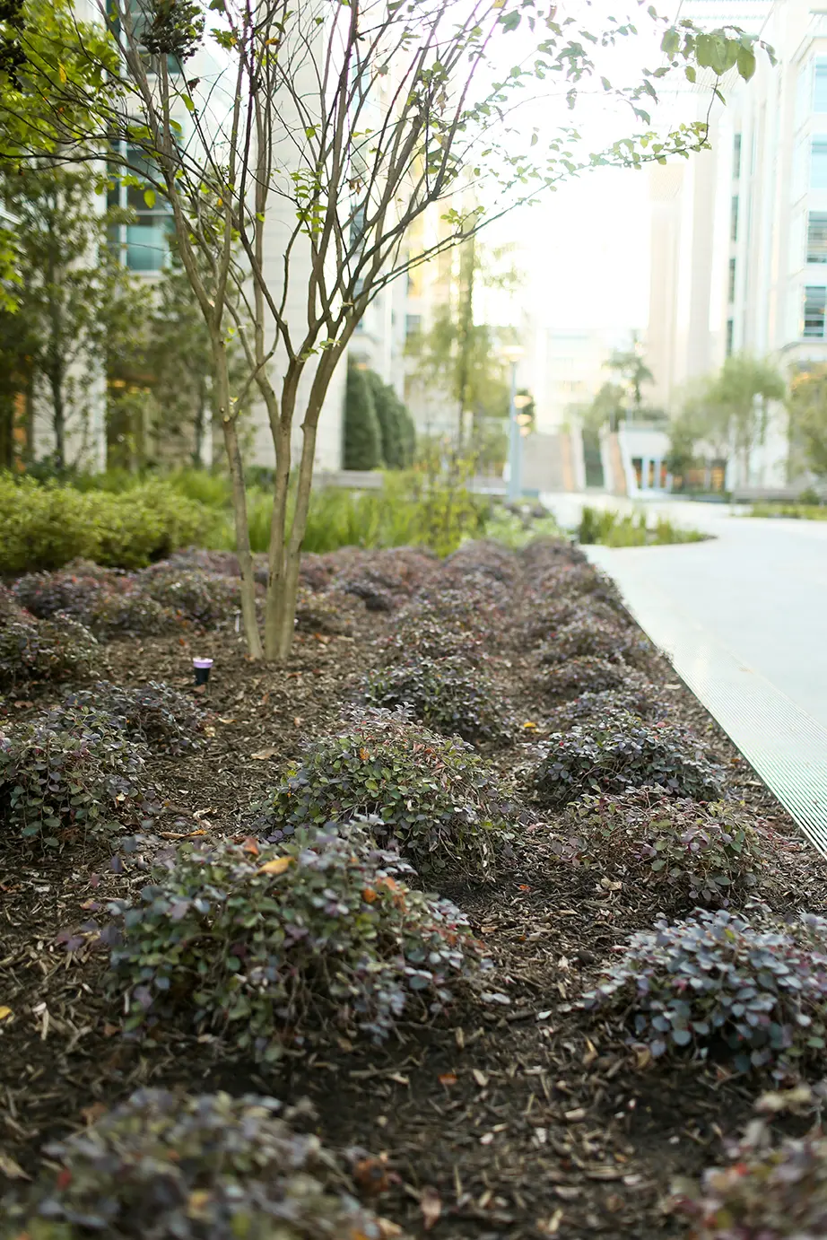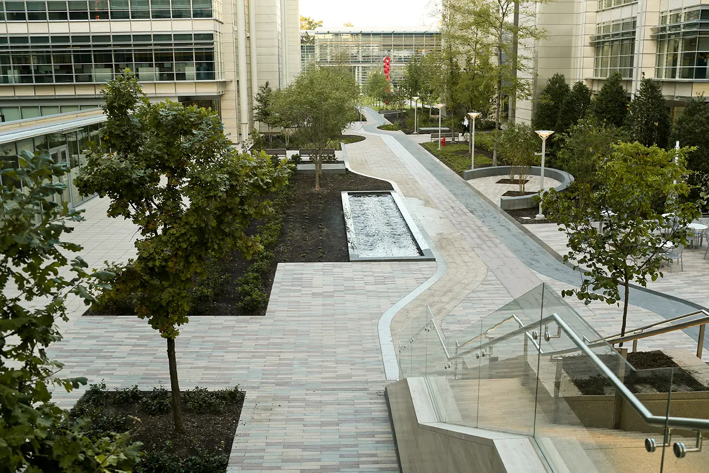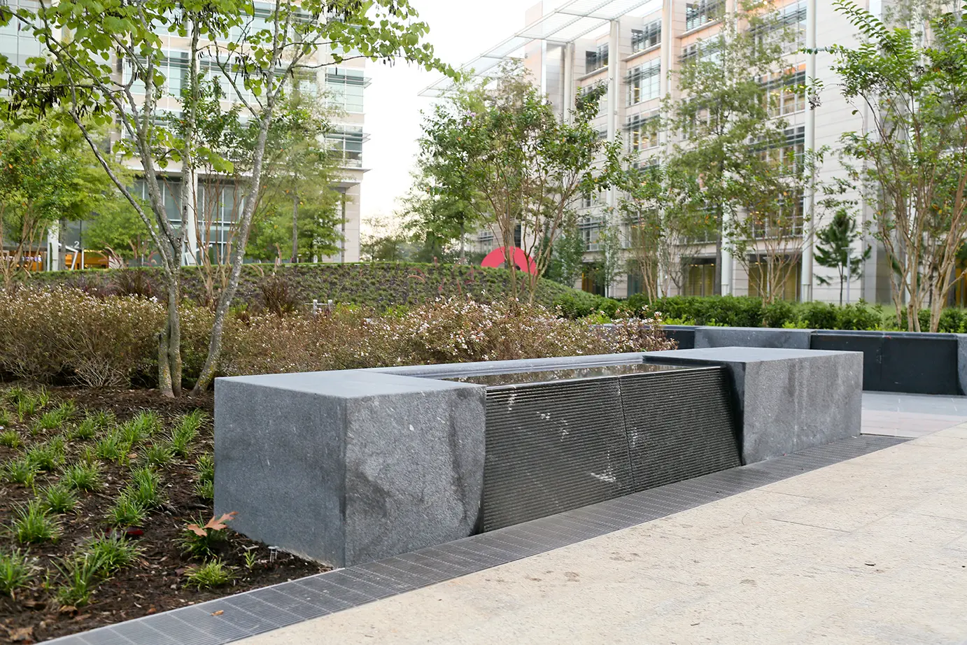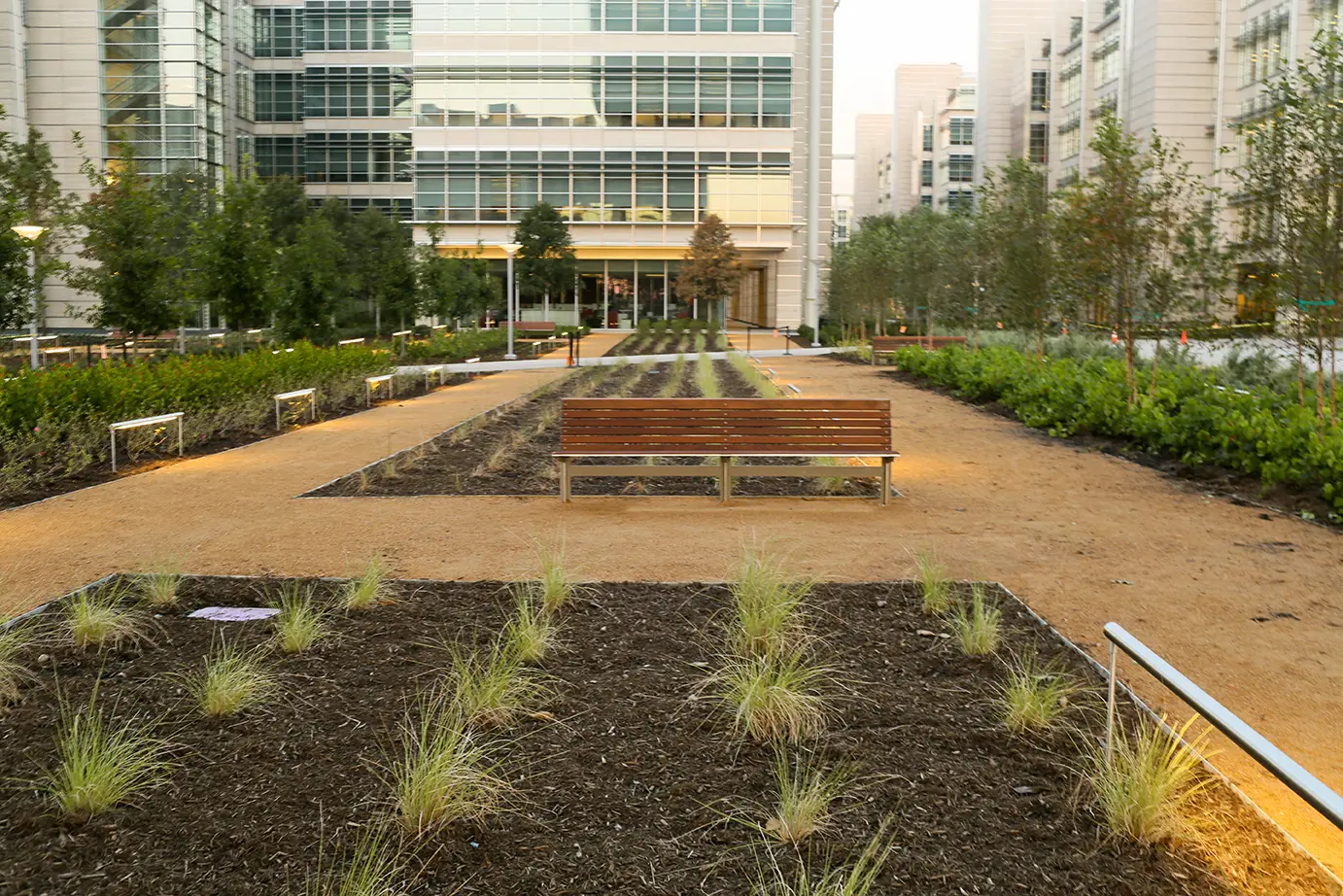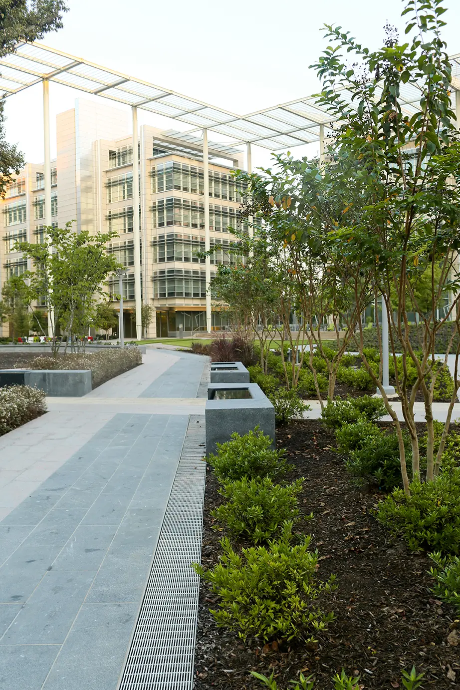 The Exxon-Mobil headquarters in Spring, Texas is a study in environmental stewardship. Opened in 2014, the campus has achieved Gold-level LEED certification, thanks to its sustainable design and energy and water efficiency. To achieve the highest levels of sustainability in the campus landscape, smart irrigation systems were employed that utilize rainwater captured onsite. Eighty-percent of the campus remains vegetated, and what doesn’t remain in its natural state features native plant material.