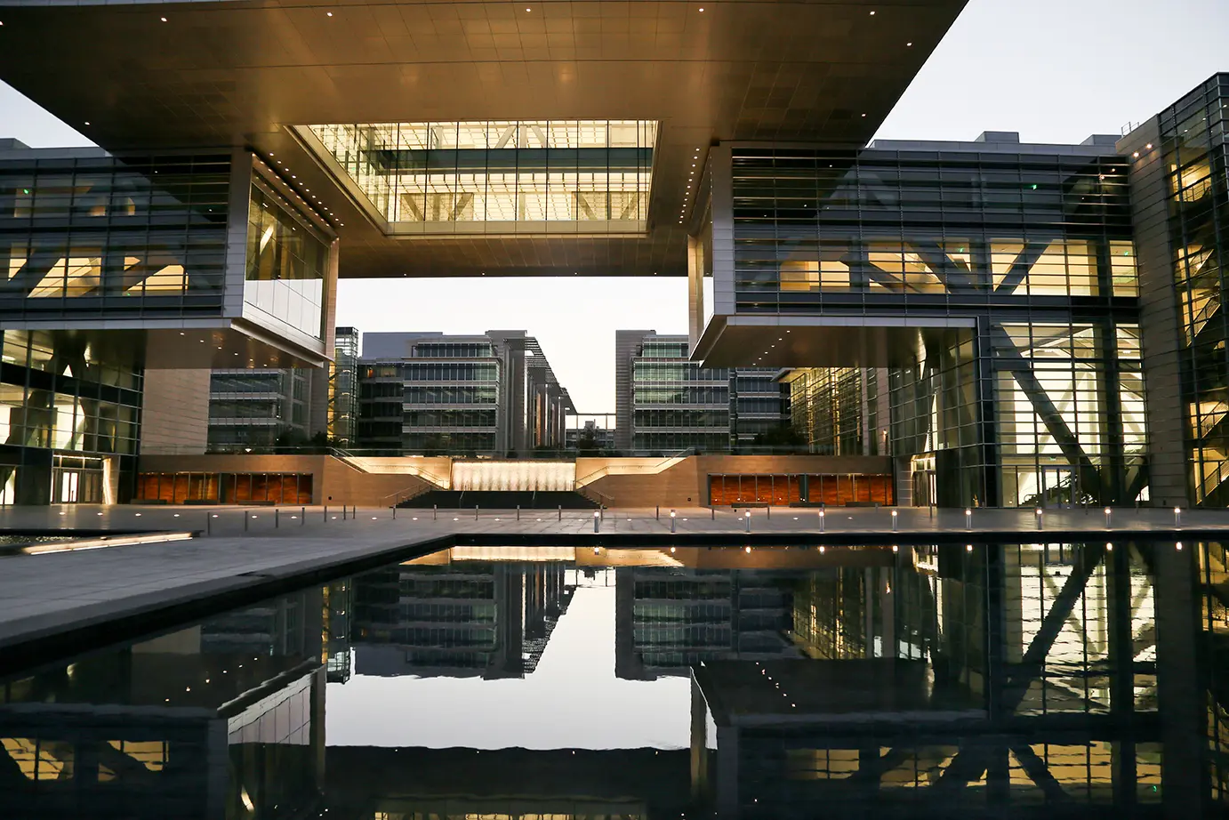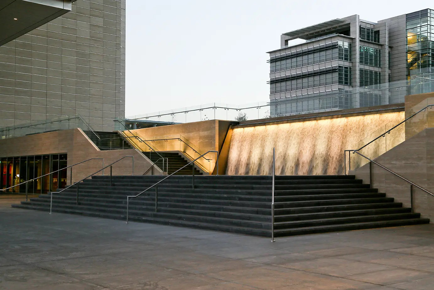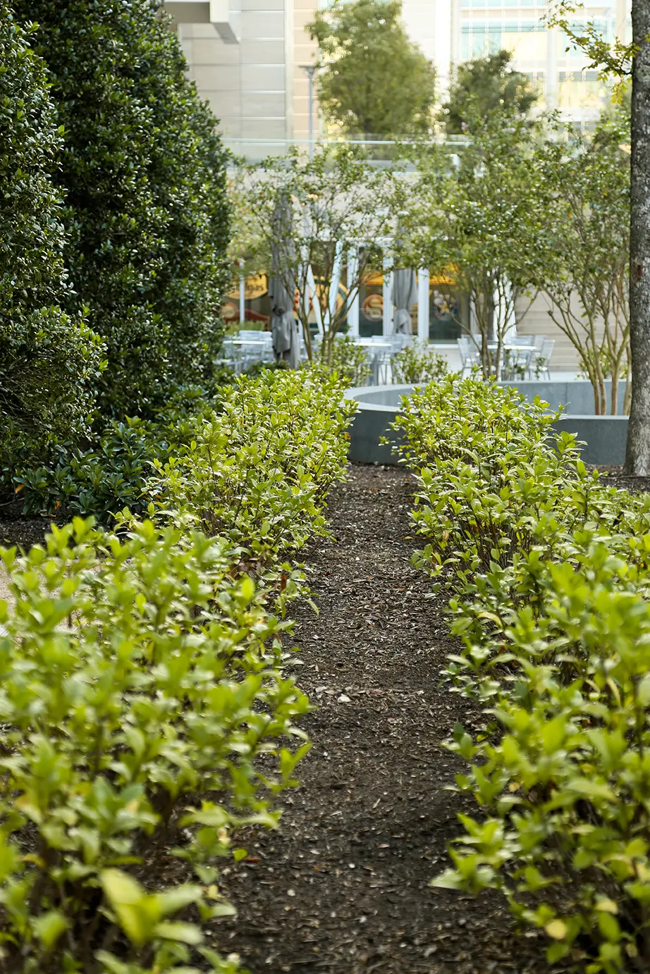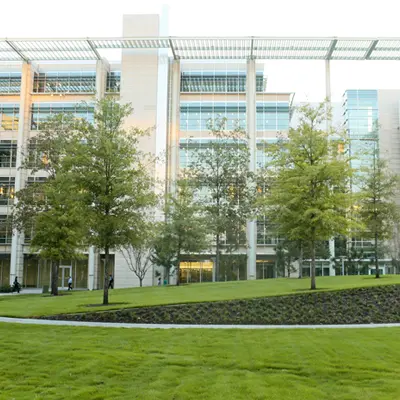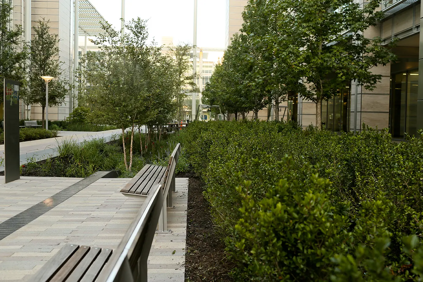 The Exxon-Mobil headquarters in Spring, Texas is a study in environmental stewardship. Opened in 2014, the campus has achieved Gold-level LEED certification, thanks to its sustainable design and energy and water efficiency. To achieve the highest levels of sustainability in the campus landscape, smart irrigation systems were employed that utilize rainwater captured onsite. Eighty-percent of the campus remains vegetated, and what doesn’t remain in its natural state features native plant material.