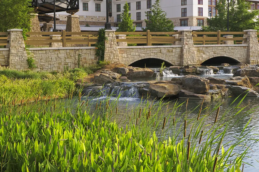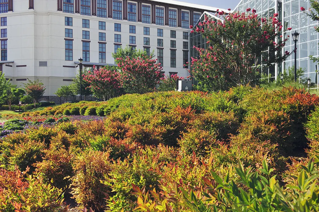 Working closely with Gaylord Texan’s Exterior Grounds Supervisor, Brightview cares for the exterior of the property. The team mows, weeds plant beds, prunes plants and trees, power washes pathways and pool areas, picks up trash and sprays to wean off pests and rodents. Onsite enhancements include color changes multiple times a year and the installation of a streambed around the property’s perimeter. A six-control satellite irrigation system controls 180 zones while an onsite weather station helps to prevent over watering.