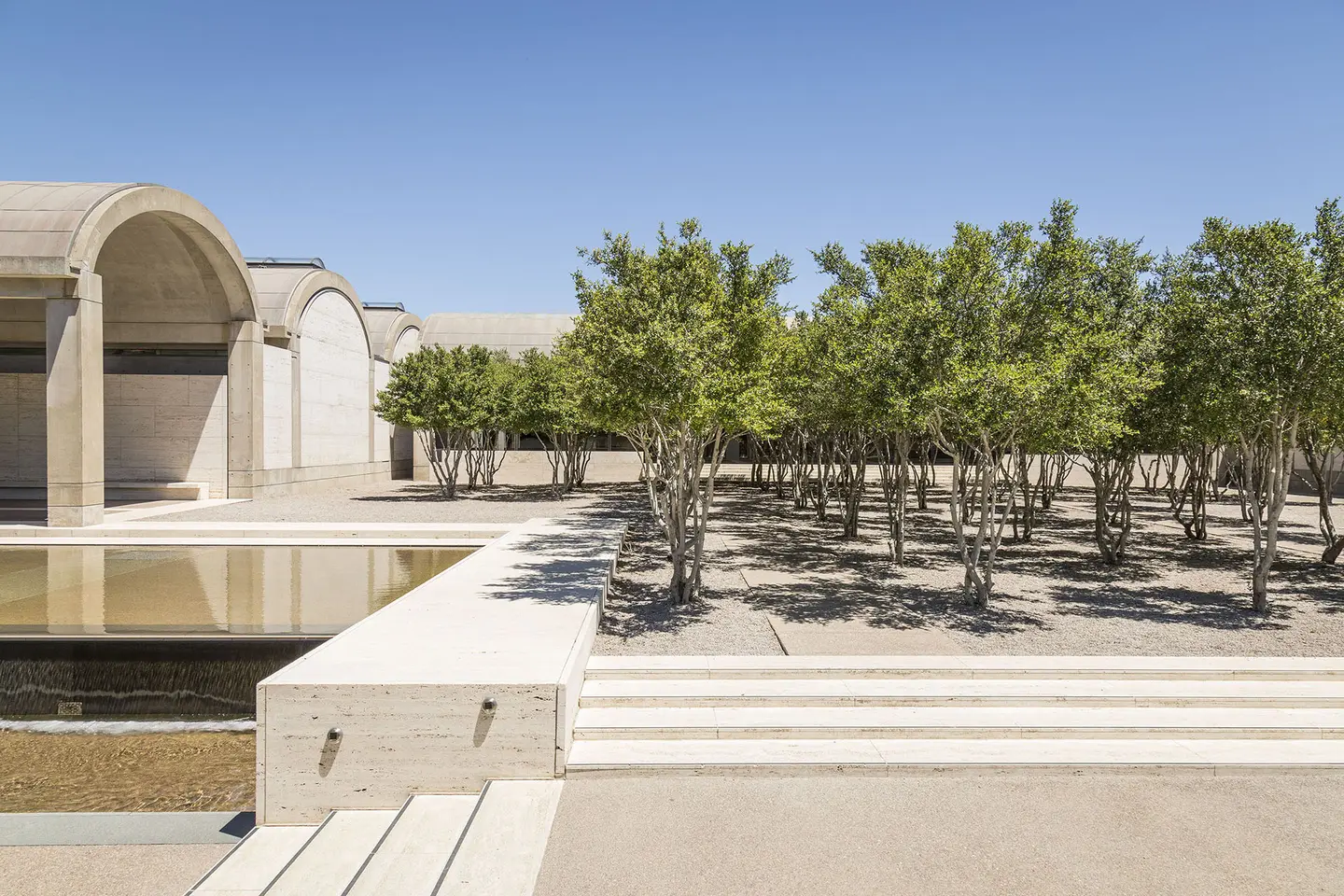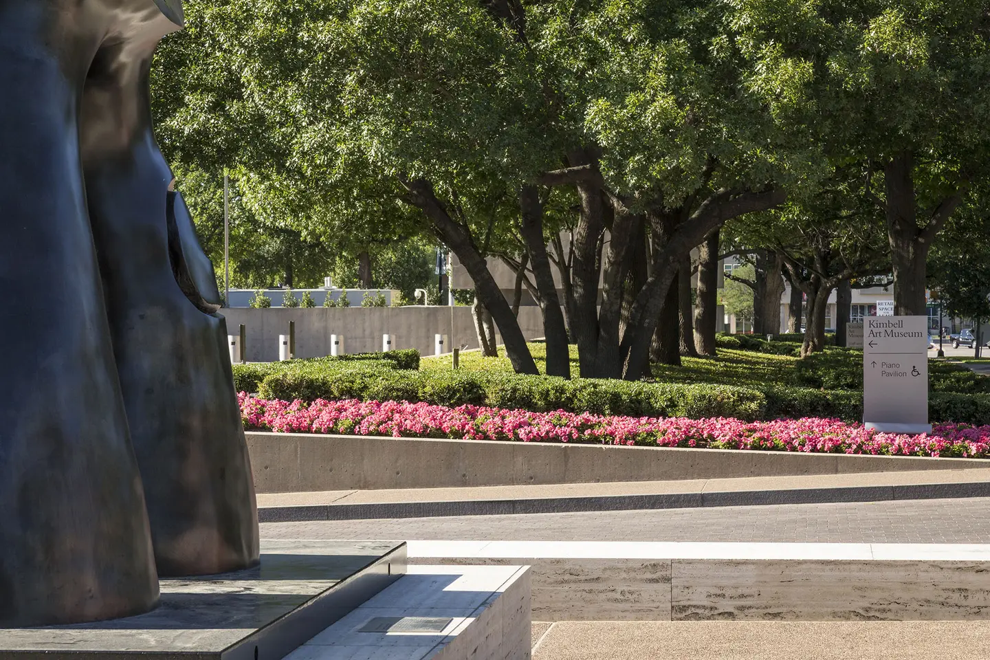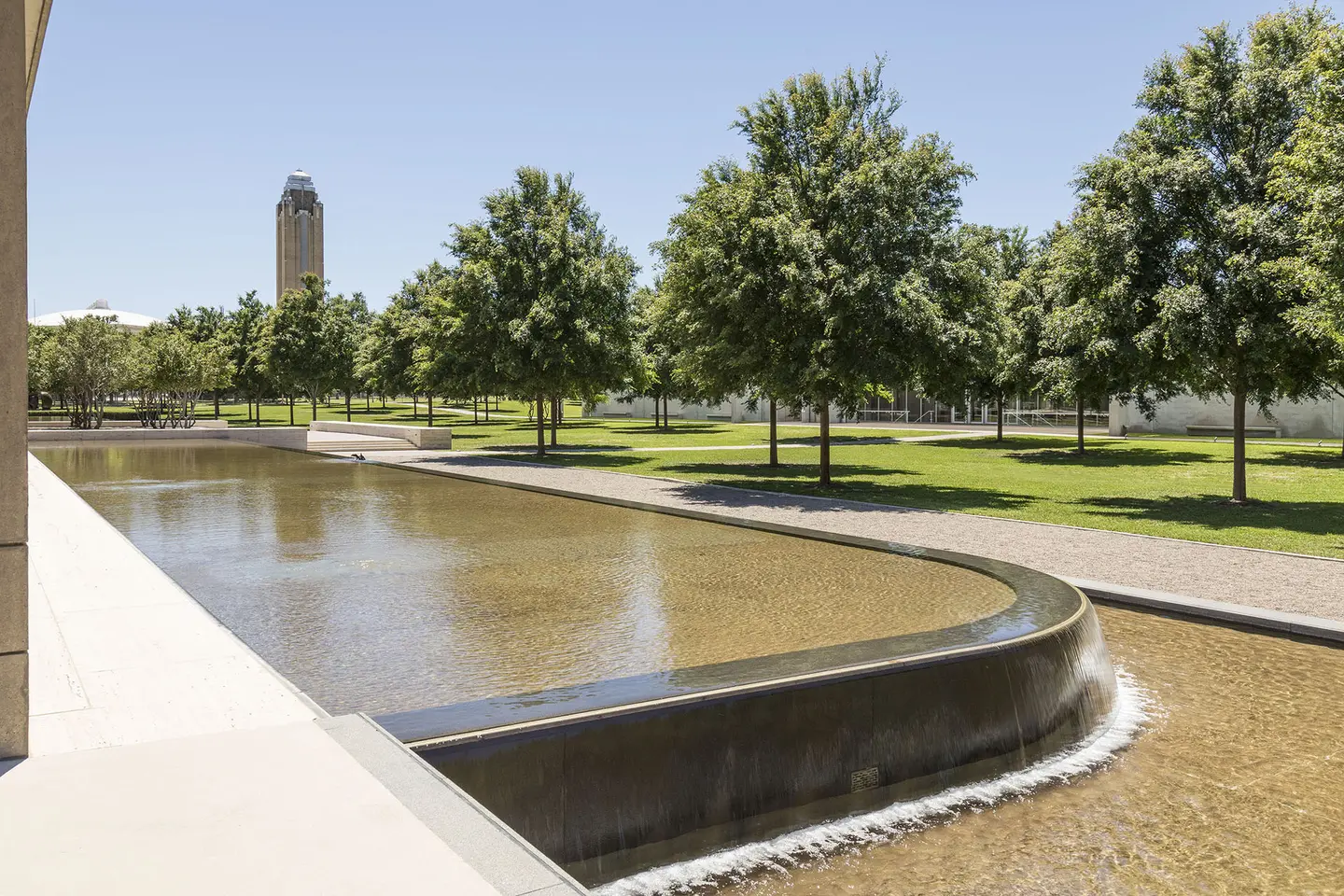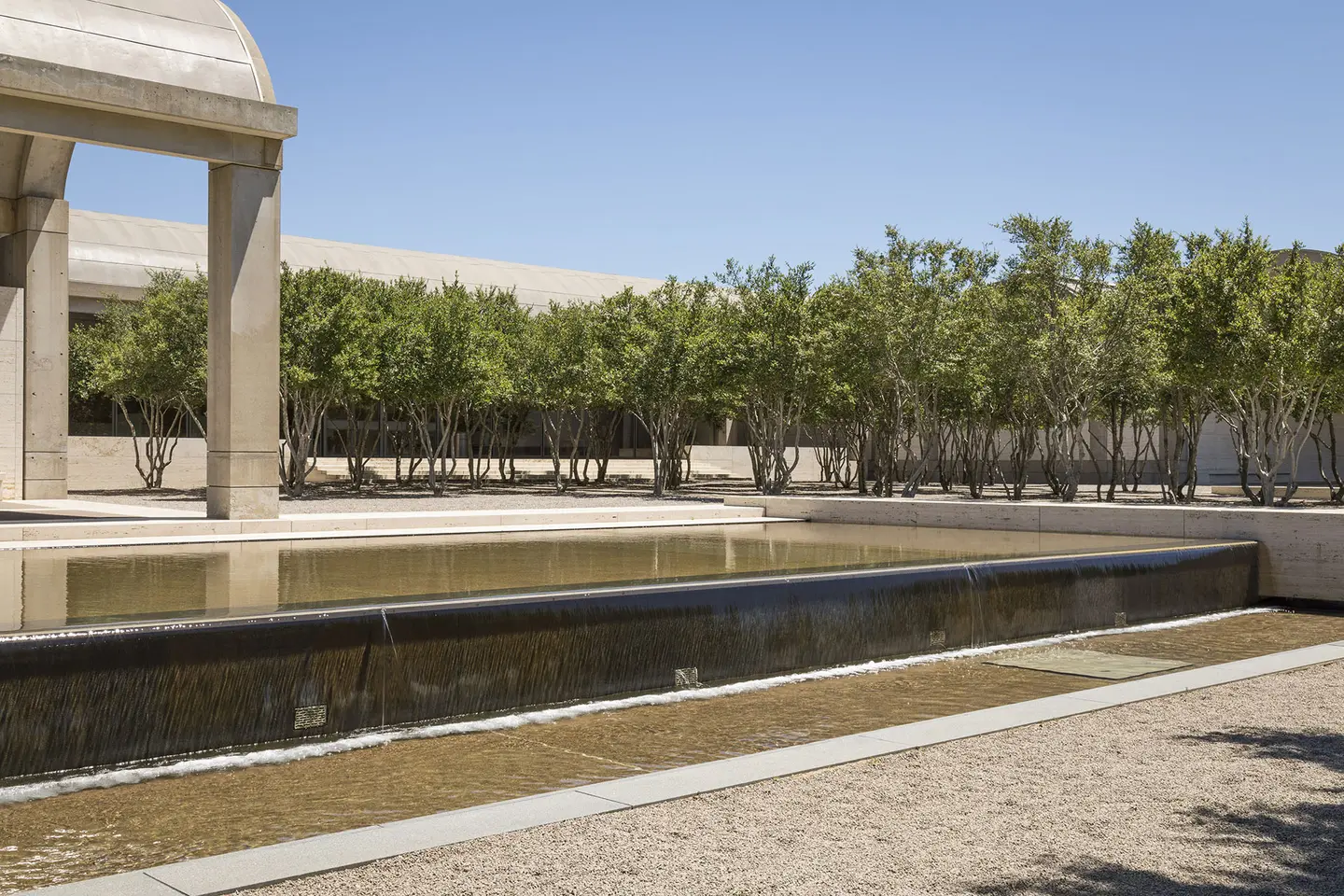 The extraordinary works of art contained within the Kimbell Art Museum are something to behold; but so too is the landscape that welcomes visitors, which is a study in texture and pattern. Orderly lines of trees create a motif across a neatly manicured lawn. Swooping rooflines are echoed in a gentle, curving fountain. Using hardscape, plants and trees as a medium, the landscape paints a tribute to the artists the museum features.