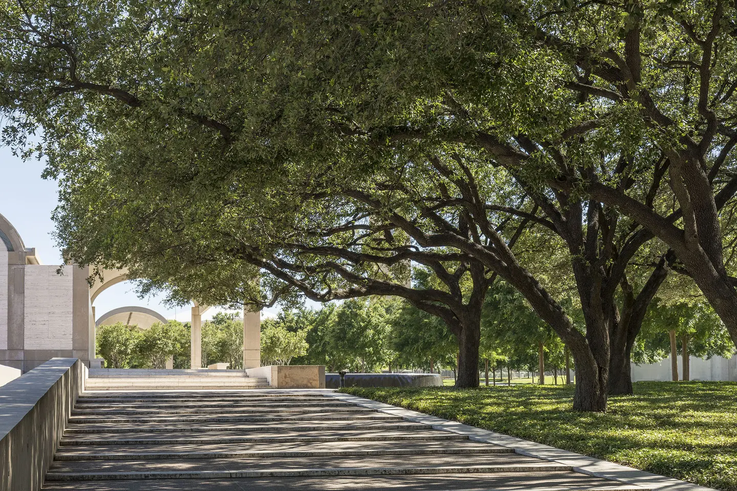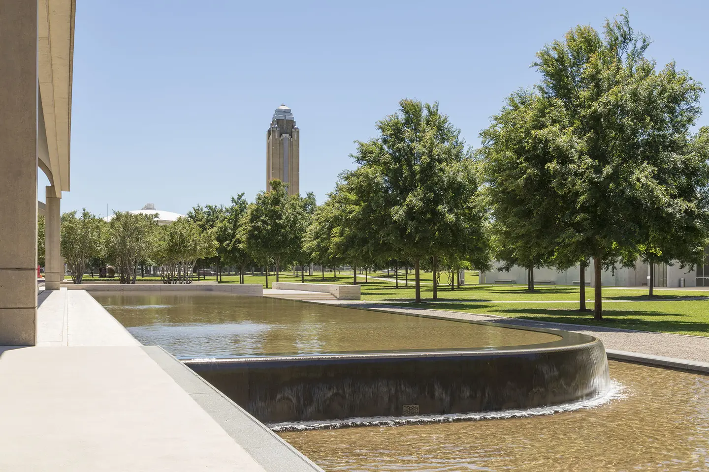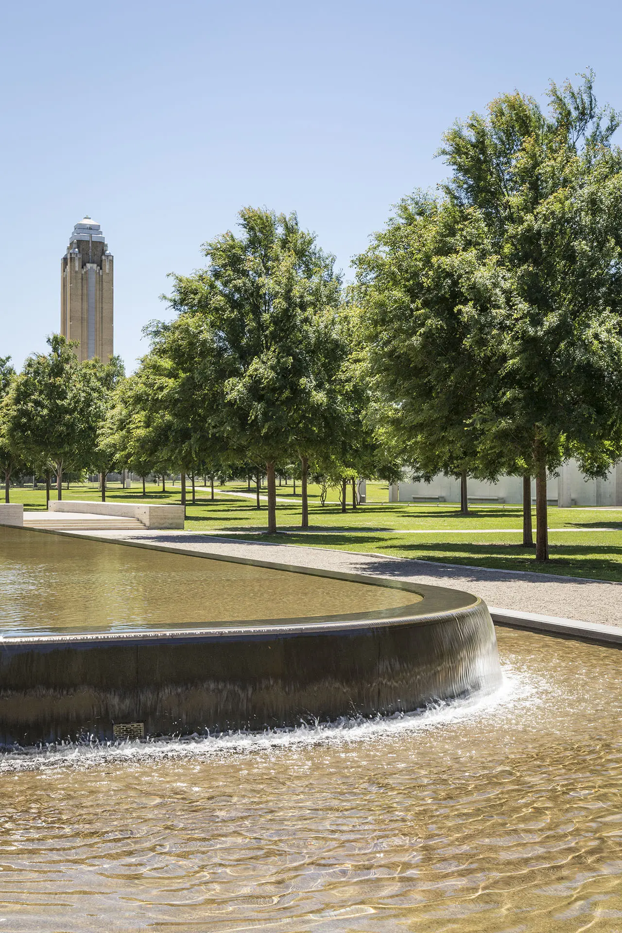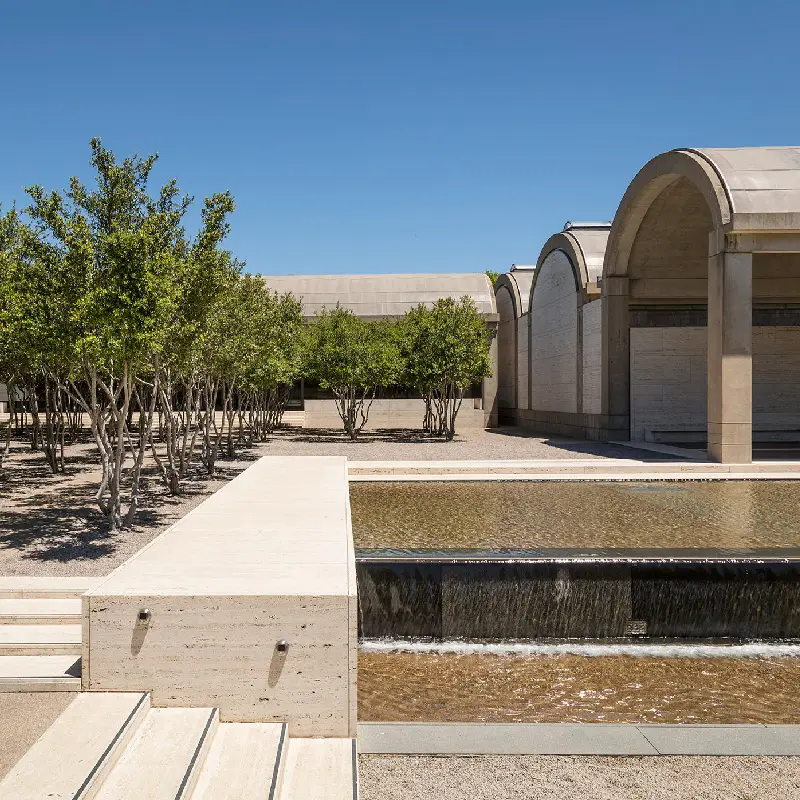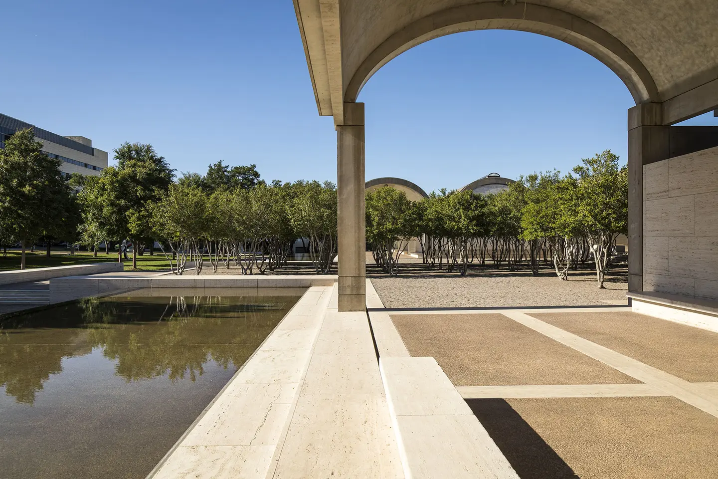 The extraordinary works of art contained within the Kimbell Art Museum are something to behold; but so too is the landscape that welcomes visitors, which is a study in texture and pattern. Orderly lines of trees create a motif across a neatly manicured lawn. Swooping rooflines are echoed in a gentle, curving fountain. Using hardscape, plants and trees as a medium, the landscape paints a tribute to the artists the museum features.