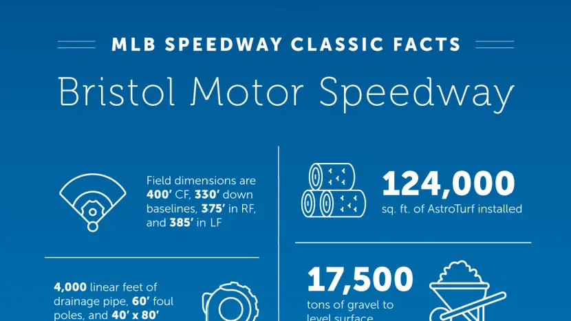 Have you ever wondered what it took to transform a NASCAR racetrack into a Major League Baseball field? Our infographic breaks down the numbers behind the MLB Speedway Classic at Bristol Motor Speedway—from the acres of turf laid to the thousands of tons of gravel and clay hauled in to create a field fit for the pros. Check out these fun facts to see the scale, precision, and teamwork that made this field a reality—right in the middle of the infield.