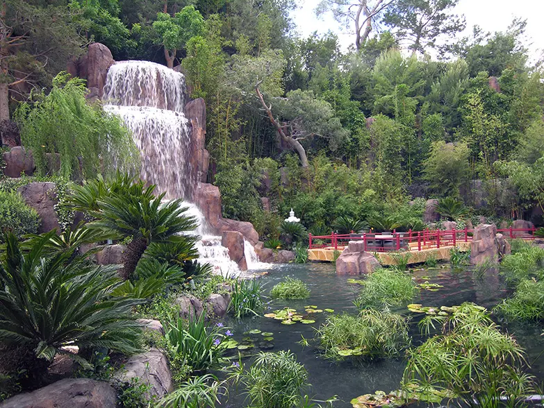 The 42-story Wynn Resort and Casino is a 192-acre, upscale megaresort boasting 18 pools, a towering 150-foot-tall mountain with a five-story waterfall that cascades into a three-acre lake, and an 18-hole championship golf course.